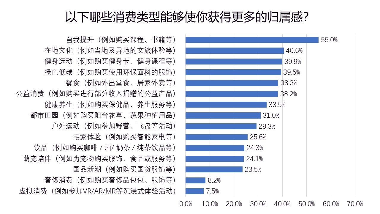 针对以下众多的消费类型,认为通过自我提升(例如购买课程、书籍等)和在地文化(例如当地及异地的文旅体验等)能获得更多归属感的人群占比较高。
