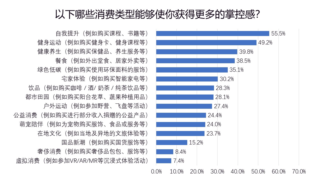 针对以下众多的消费类型,认为通过自我提升(例如购买课程、书籍等),健身运动(例如购买健身卡、健身课程等)和健康养生(例如购买保健品、养生服务等)能获得更多生活掌控感的人群占比较高。