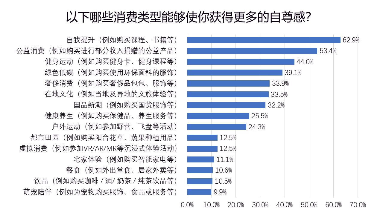 针对以下众多的消费类型,认为通过自我提升(例如购买课程、书籍等),公益消费(例如购买进行部分收入捐赠的公益产品)和健身运动(例如购买健身卡、健身课程等)能获得更多自尊感的人群占比较高。