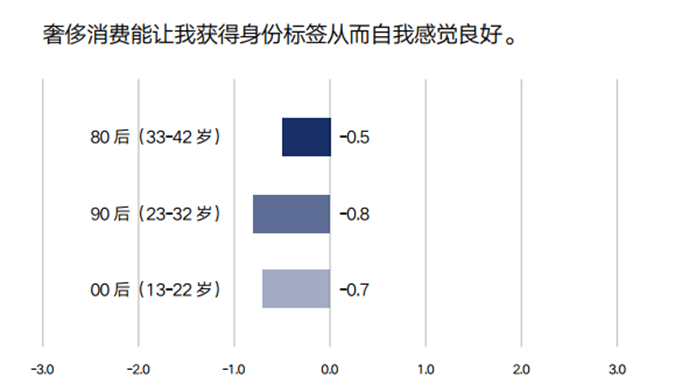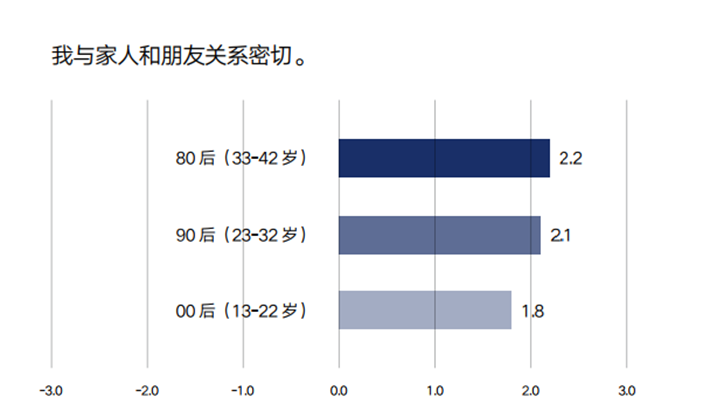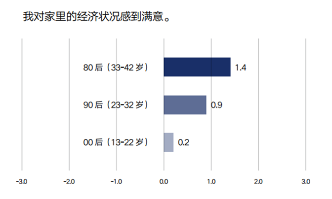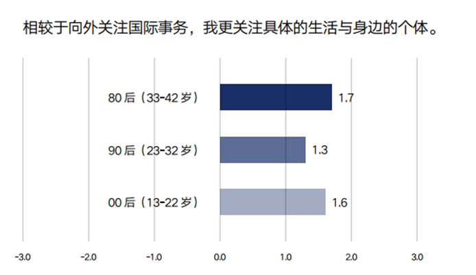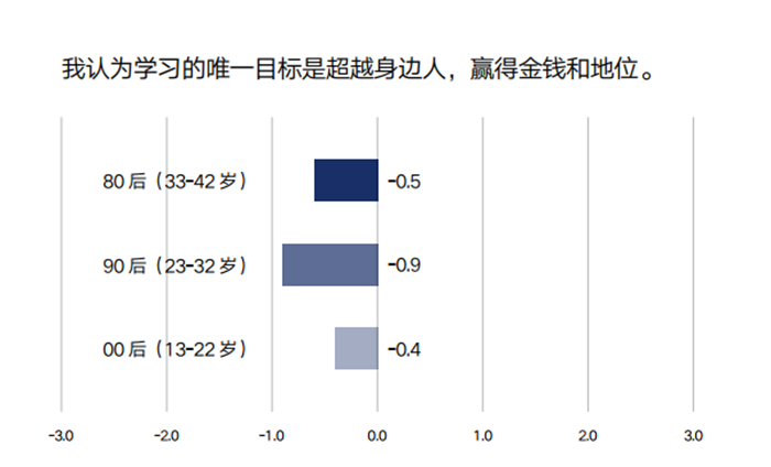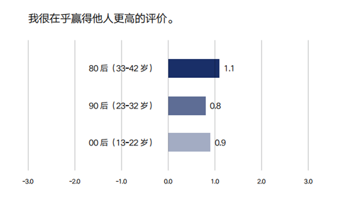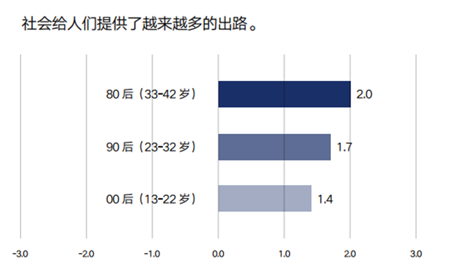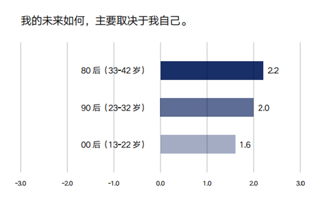 对于标题的表述,图中横坐标轴数值-3表示完全不同意,-2表示很大程度不同意,-1表示有点不同意,0表示不确定,1表示有点同意,2表示很大程度同意,3表示完全同意。柱状图对应的数值是根据调研结果计算得出的该代际受访者填写数值的总体平均水平。数值越大,同意程度越高;数值越小,同意程度越低。