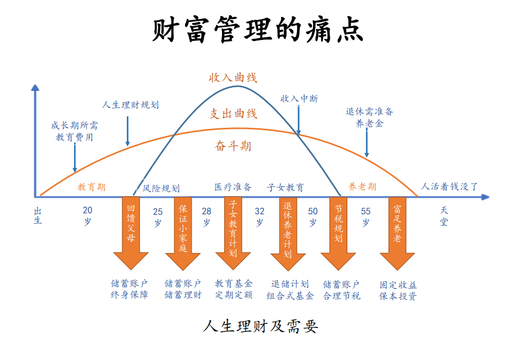 人的一生有一个自然生命周期,财富同样有一个生命周期。一般我们把财富的生命周期用两条线表示:橘色的支出曲线和蓝色的收入曲线,分别代表现金的流出和流入。很显然,这两条线并不吻合,这就注定在人生的某个阶段,现金流出会大于流入,从而出现资金缺口,需要融资的情况。