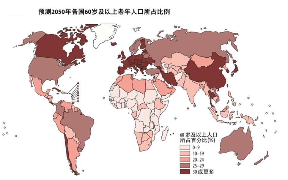 很多国家已经率先进入了老龄化社会,养老问题比中国更严重。联合国预测了2050年各国60岁及以上老年人口所占的比例,颜色越深代表老龄化的程度越高。