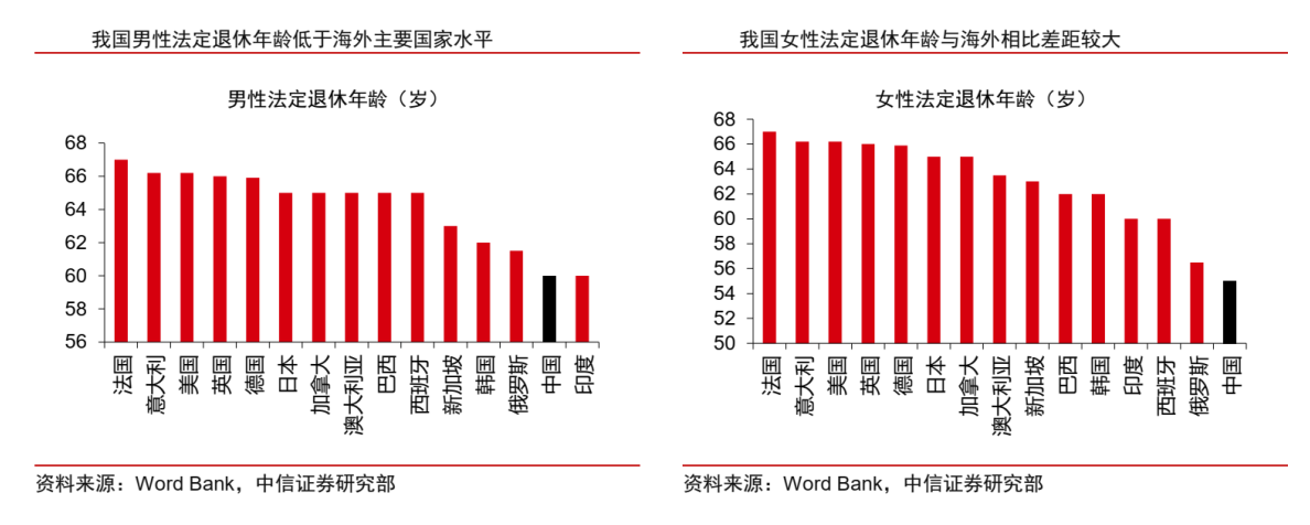 中国现在的男性法定退休年龄是60岁,女性是55岁,与上图其他国家相比是偏低的。