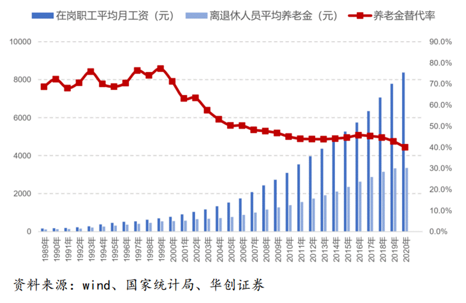 有一个客观的指标,叫作养老金替代率,是指劳动者退休时的养老金领取水平与退休前工资收入水平之间的比率。中国的养老金替代率在下降。根据世界银行的建议,养老金替代率在70%~80%就可以保证退休以后生活水平基本保持不变,60%的替代率只能保证最基本的生活水平,55%已经处在警戒线附近。中国现在的养老金替代率是45%,远远低于55%的国际警戒线水平。