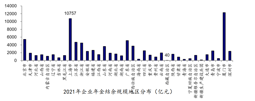 企业年金还存在着区域间结构不平衡的问题,以2021年企业年金结余规模地区分布为例,结余多的都是发达地区和城市。
