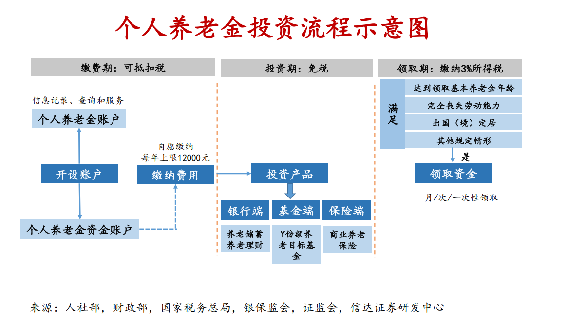 根据个人养老金投资流程示意图,首先要开设一个个人养老金账户,可以自愿缴纳,每年的上限为人民币12000元。然后进行投资,投资的产品主要分成银行端、基金端和保险端三类。