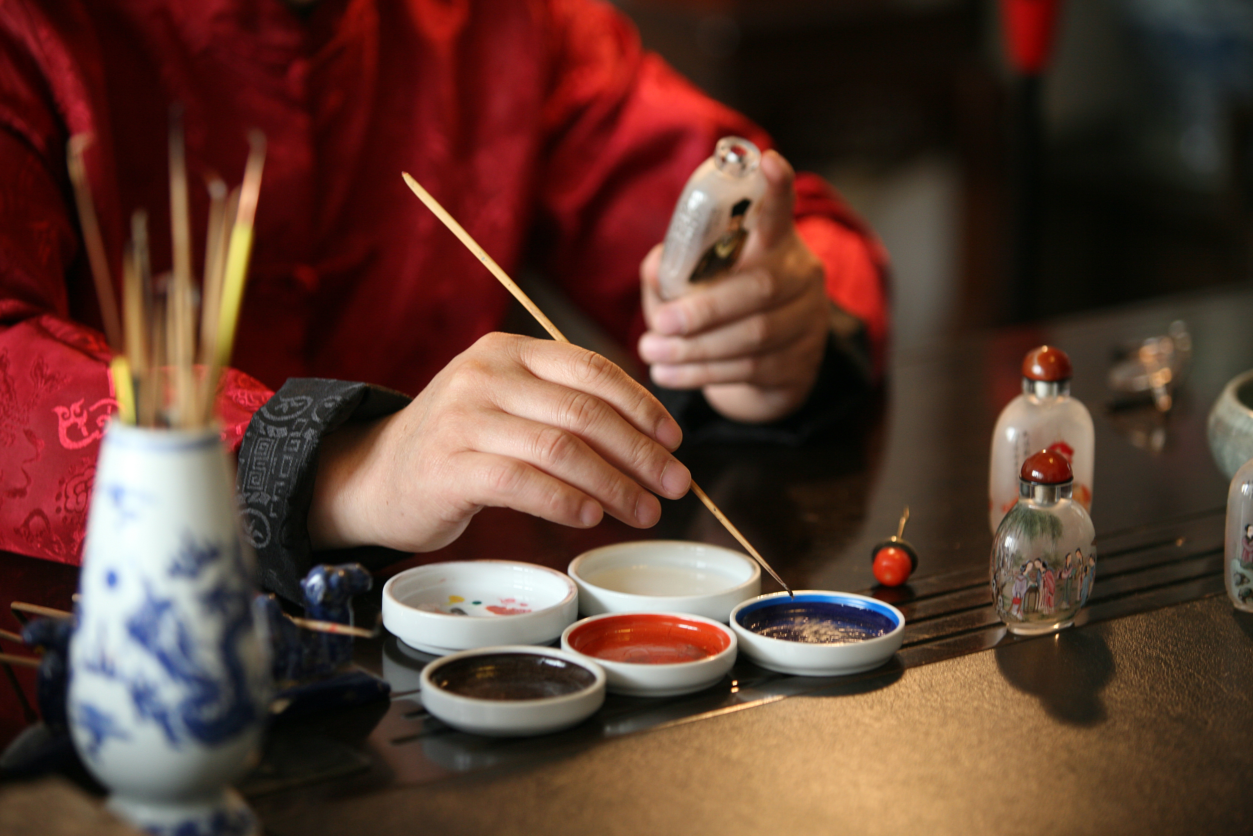 据说利玛窦在明朝万历年间以鼻烟入贡,鼻烟很快风靡朝野。鼻烟是唯一不用点火的烟,吸时以指端蘸烟少许,在鼻孔上一抹,再猛吸气,异香怡人(不好意思,这都是书上看来的,信不信由你)。大户人家待客,需要备好鼻烟,不仅烟有优劣,装鼻烟的壶也能显示品位和身份。讲究之下,鼻烟壶就发展成了一门独特的手艺。据说早期讲究的是材质,有水晶、玛瑙、玉石、翡翠的,还要精雕细镂。后来都用透明的玻璃,以极细的彩笔从里面画出山水人物,栩栩如生,细致动人,巧夺天工。这样细致的功夫,在景区商店里也不过是三四十元的价格,真不知道是怎么画出来的。
