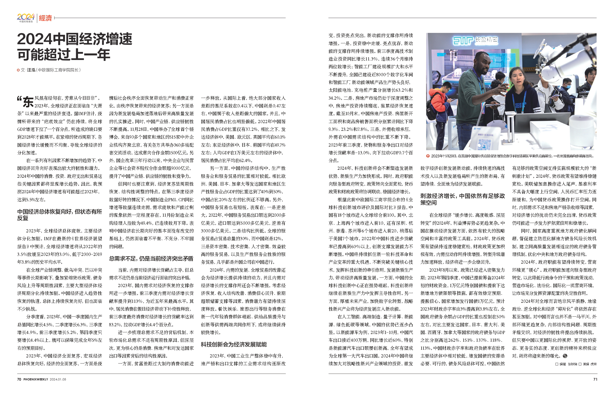 在一系列有利因素不断增加的趋势下,中国经济回升向好表现出较大的韧性和潜力。2024年中国的消费、投资、政府支出和贸易这些关键因素都将呈现增长趋势。因此,我预测2024年中国经济增速有可能超过2023年,达到5.5%左右。