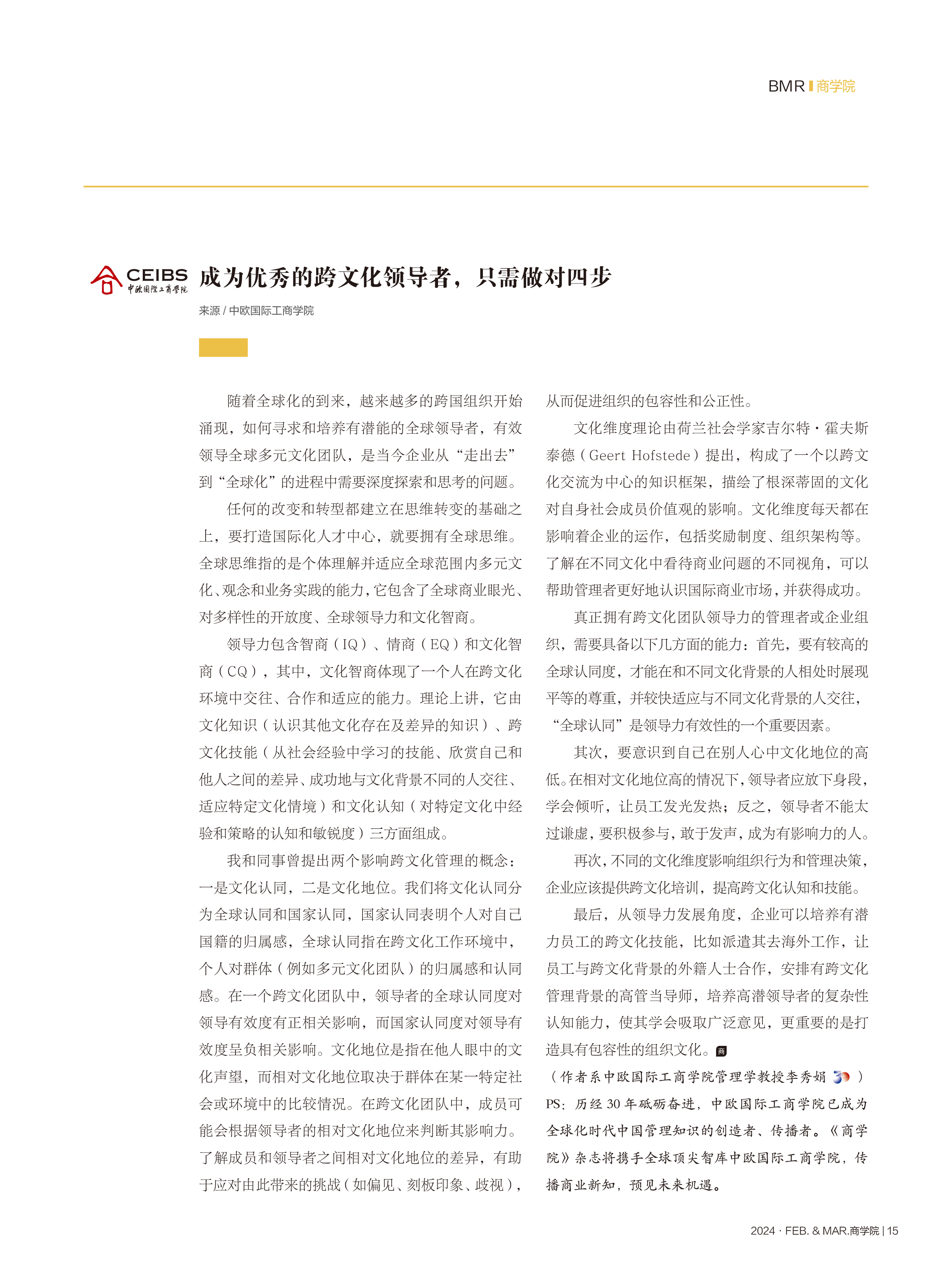 她深度阐释了领导力三商(智商、情商和文化智商)中的文化智商,提出优秀的跨文化领导者必须具备较高的全球认同,同时也要意识到“相对文化地位”对跨文化管理的重要影响。最后,李秀娟教授分享了磨炼跨文化能力的四个步骤。