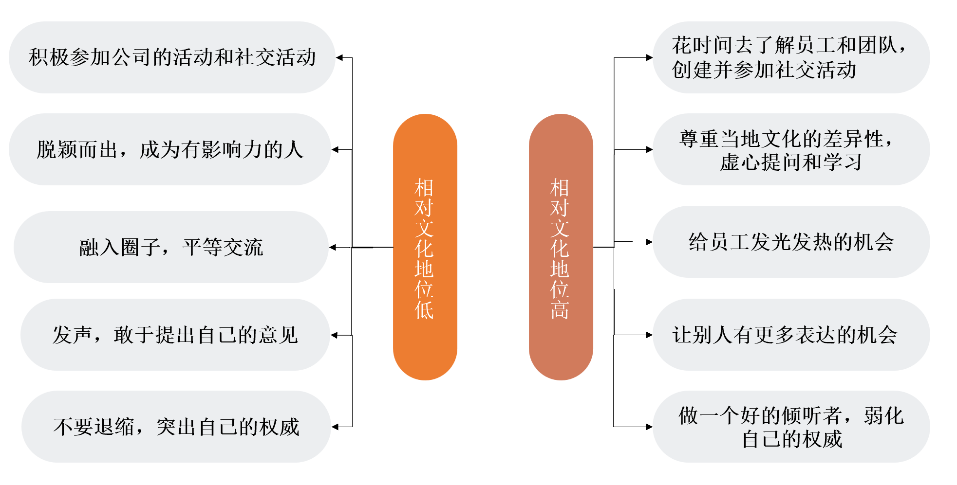 其次,即使某领导者拥有了较高的全球认同度,但也要意识到自己在别人心中文化地位的高低。在领导相对文化地位高的情况下,他应放下身段,学会倾听,让员工发光发热;反之,则不能太过谦虚,要积极参与、脱颖而出,要敢于发声,成为有影响力的人。