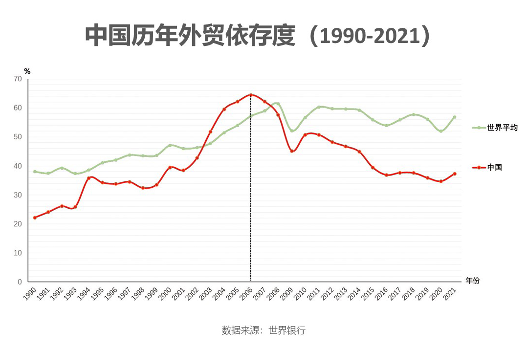 从外贸依存度看,我国对外贸易发展在1990—2010年间先升后降,与全球总体走向基本一致。冷战结束后,全球进入“超级全球化”黄金期,中国外贸依存度也快速提升,2006年达到历史巅峰64.48%,国内企业借助对外贸易完成原始积累。2010年之后,我国外贸依存度在波动中逐渐下降,这既是由于金融危机之后全球经济受阻、主要贸易伙伴需求疲软,也是我国主动构建新发展格局的结果。当前中国外贸依存度(约35%)高于美国(约20%),与英、法大致相当,经济结构总体合理。