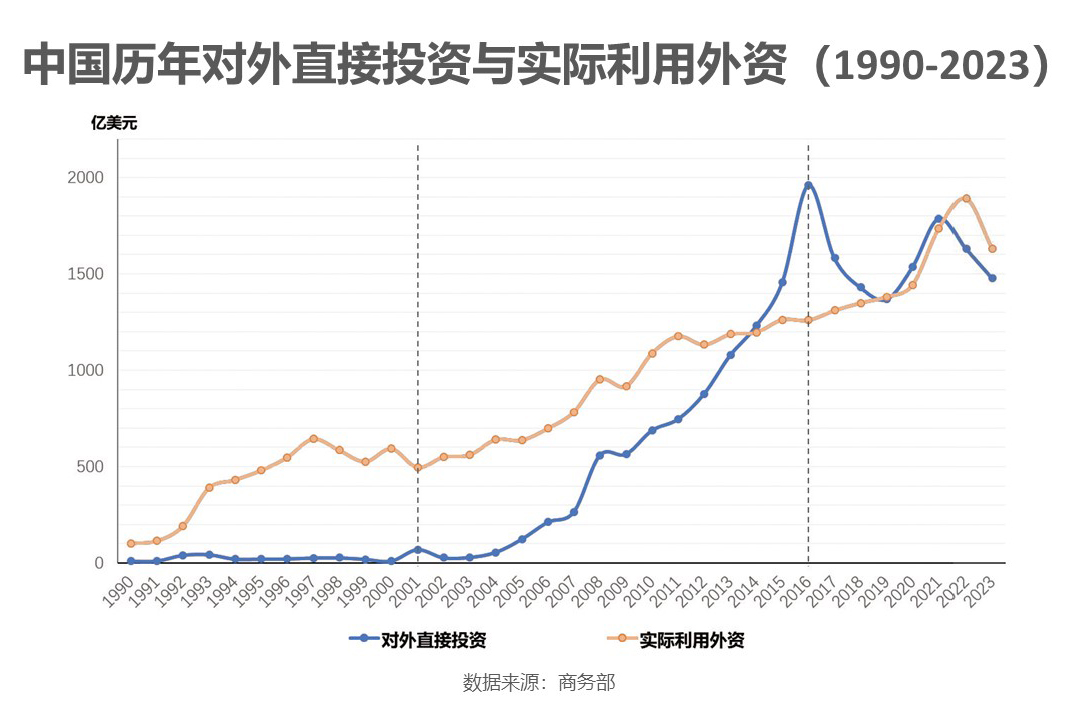 从对外投资与利用外资看,1990—2000年中国以“引进来”为主,“以市场换技术”,实际利用外资额从1990年的102.89亿美元猛增至2000年的593.56亿美元;2001—2016年以“走出去”为主,对外直接投资流量从2001年的69亿美元飙升至2016年的1961亿美元,分布于全球190多个国家和地区;2016年至今,我国维持“引进来”与“走出去”的均衡,巩固双向投资大国地位。