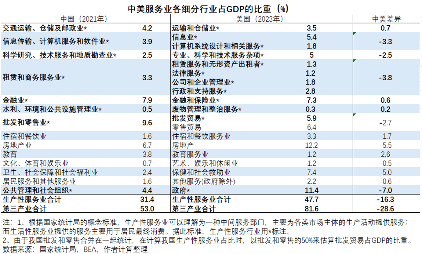 我通过中、美两国最新数据做了对比(其中美国数据为2023年、中国第三产业更加细分行业的数据只公布到了2021年):2023年美国第三产业占GDP的81.6%,其中生产性服务业占GDP的47.7%。而2021年我国第三产业仅占GDP的53%(2023年为54.6%),其中生产性服务业占比比美国低了16个百分点左右,只有31.4%。从生活性服务业占GDP的比重看,我国只有21.6%,美国为33.9%,也比我国高。