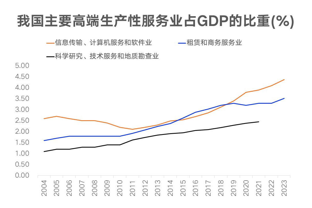 从细分行业看,我国服务业当中的高端部分与美国差距较大。在我根据国家统计局数据整理的这份表格中(上图),打星号的都是生产性服务业,不打星号的属于生活性服务业。信息科技、专业技术服务等都是比较有代表性的高端生产性服务业。我国信息传输、计算机服务和软件业占GDP的3.9%,对应到美国分别是信息业占GDP的5.4%、计算机系统设计和相关服务占1.8%,合计占GDP的7.2%,所以这个领域中国比美国低了3.3个百分点;科学研究、技术服务等占我国GDP的2.5%,而美国占比5%;租赁和商务服务业,我国占GDP的3.3%,而美国对应的细分行业很多,包括租赁服务、法律服务、公司和企业管理服务、行政和支持服务等,综合来看我国比美国低了3.8个百分点。这些都属于高端的生产性服务业。