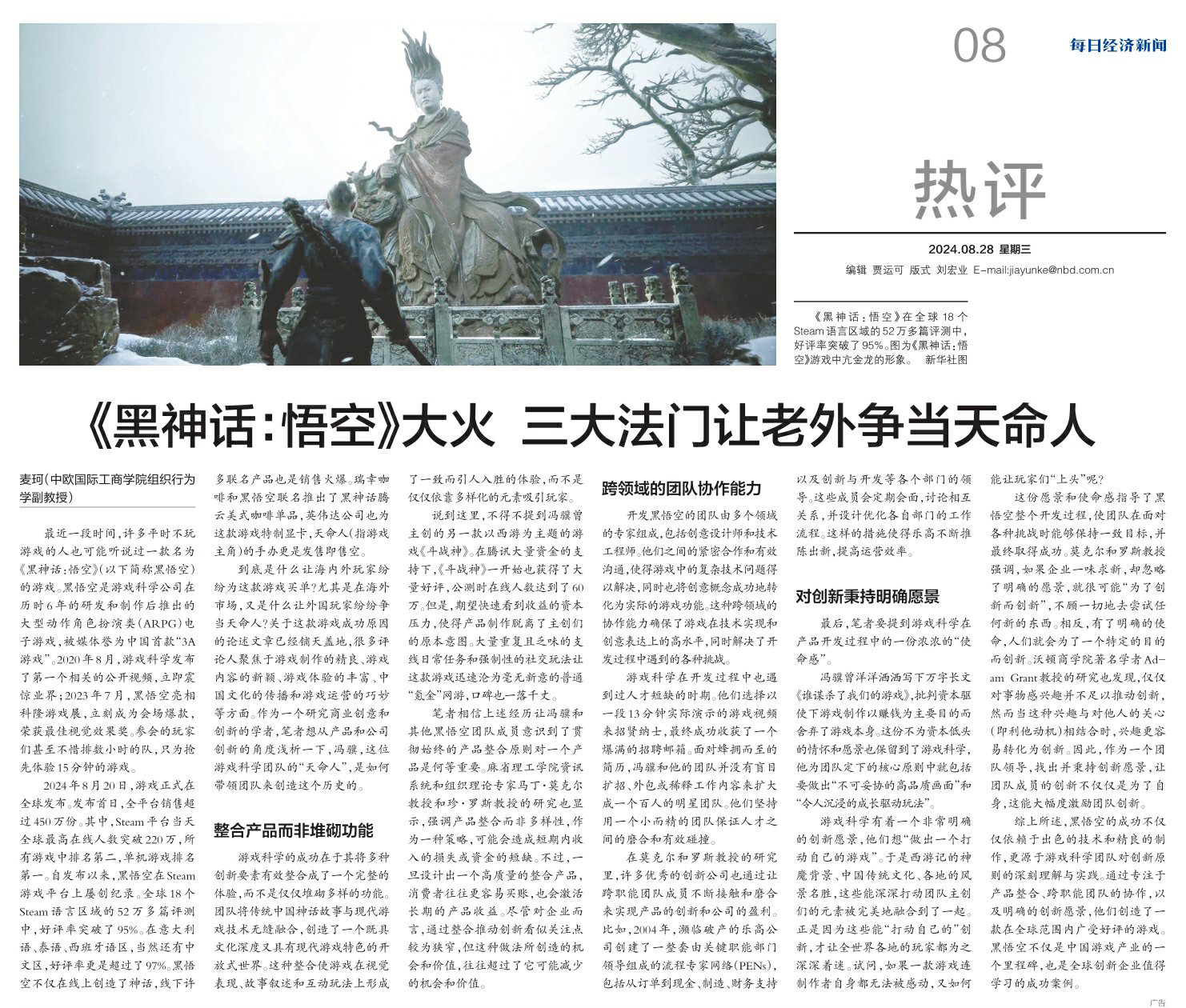 自上周二全球发布至今,国产原创3A游戏《黑神话:悟空》凭一己之力在全球游戏圈搅起了惊涛骇浪,更在社交媒体上火出圈,引发大众对这款游戏现象级火爆的热议和思考。《黑神话:悟空》不仅受到中国游戏玩家的追捧,还吸引了海量全球玩家化身“天命人”踏上西行战斗之路。到底是用了什么法门让老外们也纷纷争当“天命人”?中欧国际工商学院组织行为学副教授麦珂从产品及公司创新的角度,浅析了《黑神话:悟空》背后的成功之道。
