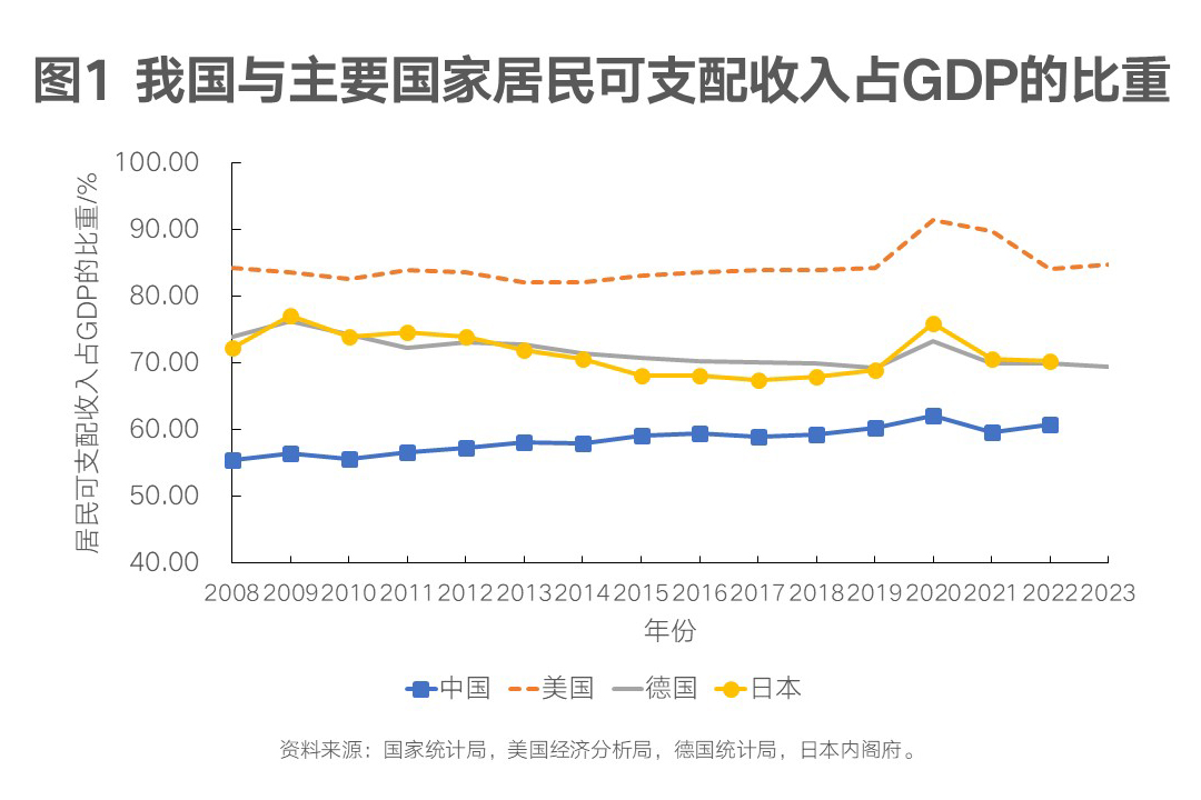 如果把主要国家居民可支配收入占GDP的比重做一个直接比较,可以发现我国居民部门的收入占比明显低于日本、德国和美国等主要国家。2022年我国居民部门可支配收入为GDP的60.8%,比日本(70.3%)、德国(69.5%)低10个百分点左右,比美国(84.9%)低20个百分点以上。当然,简单的国际比较有一定局限性,因为不同国家所处的经济发展阶段不同,而不同社会制度下的财政再分配的最优方案也是不同的。尽管如此,我国居民部门在收入分配中的占比低于其他主要经济体是显而易见的。