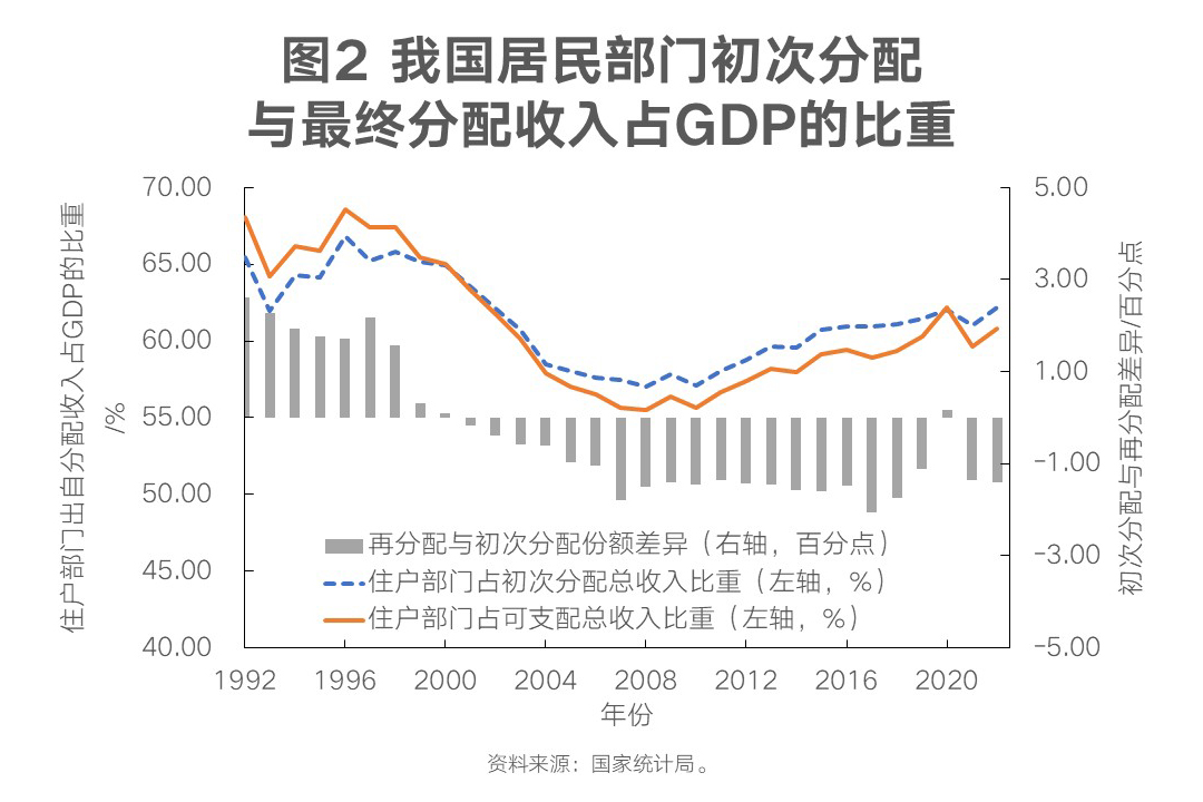 二、最近二十多年来我国居民可支配收入占比持续低于初次分配