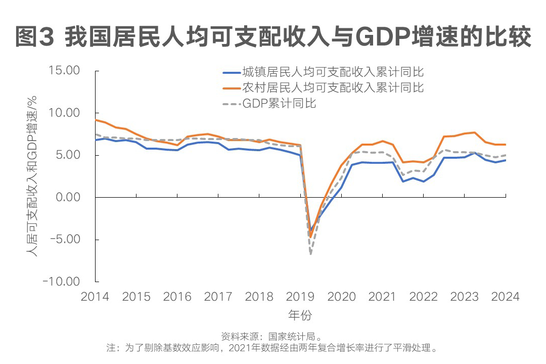 一个值得关注的现象是,近年来我国城镇居民人均可支配收入增速总体低于GDP增速。在2008年国际金融危机前,我国经济增长更依赖外部市场,即处于外向型主导经济发展阶段,城镇居民部门人居可支配收入增速持续低于同期的GDP增速,这与我国住户部门在收入分配中占比持续下降的阶段较为一致。自2013年我国统计居民人均可支配收入以来,除个别年份外,居民人均可支配收入增速总体高于GDP增速。但从内部结构看,主要是农村居民人均可支配收入增速较高,而城镇居民收入增速持续低于GDP增速。