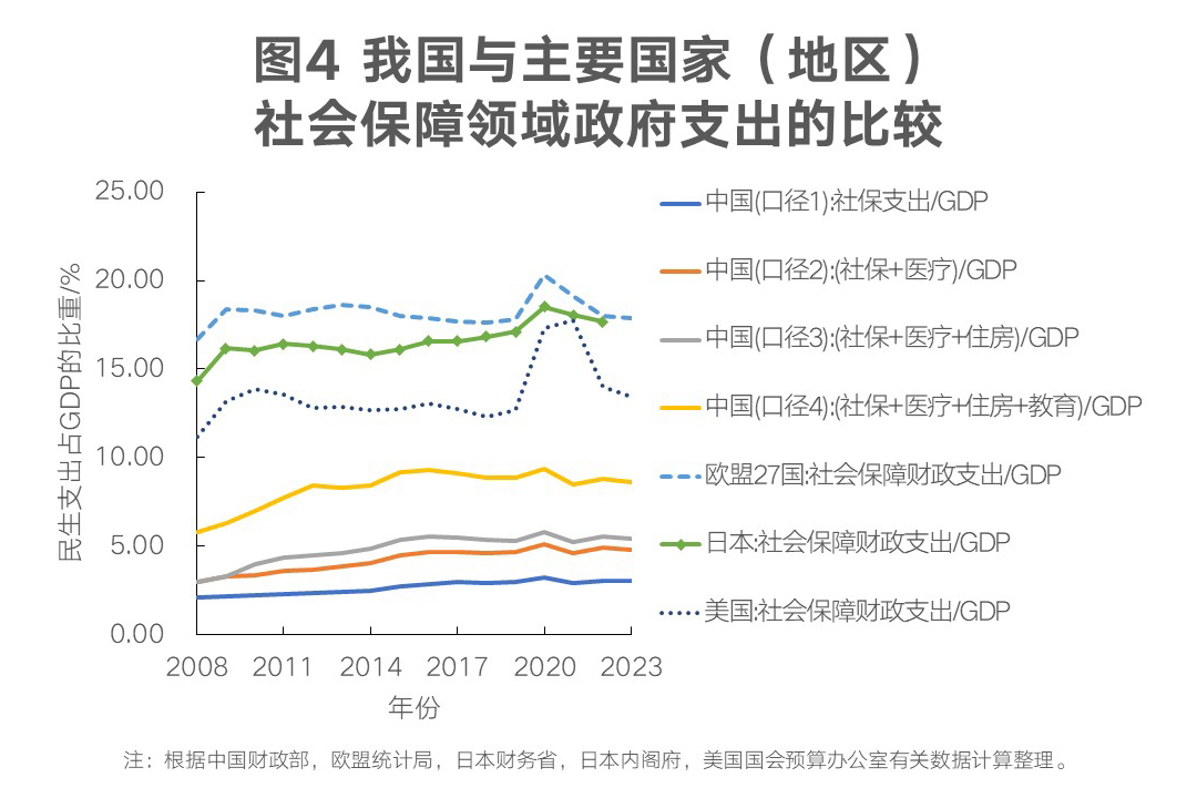截至2023年末,我国社保支出仅占GDP的3.1%(如图4中口径1),加上医疗方面的开支后(口径2)达到4.8%,社保、医疗、住房保障性支出合计(口径3)占GDP的5.5%。教育支出在严格意义上并不属于社保范畴,主要国家的社保支出中也并未纳入这一项,因此上述口径3应当作为我国与其他主要国家比较的基准。而即使以最宽口径来衡量(将我国社保、医疗、住房和教育方面的政府支出加总,即口径4),我国民生领域的政府支出也还有比较大的提升空间。
