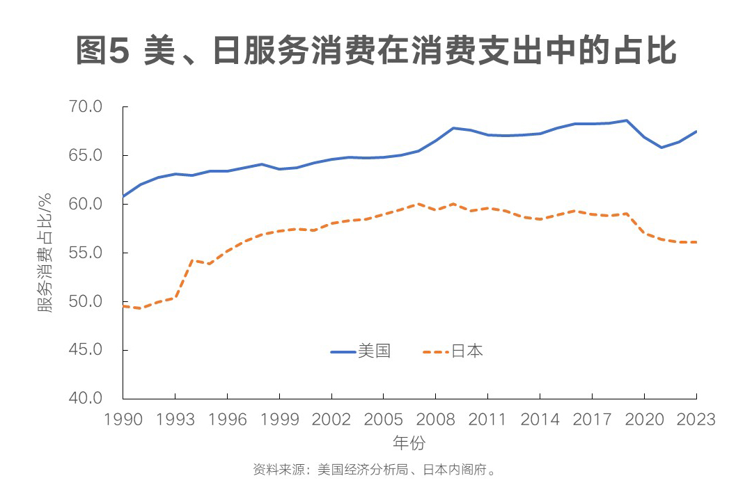 服务消费占比提升已成为全球经济发展的趋势,这一现象在美日等发达国家表现得尤为明显。目前我国服务消费占居民消费支出的比重仅52.3%(2022年),与美国、日本等国家相比还有较大差距。在美国,服务占居民消费支出的比重从1990年的60.8%上升至疫情前的68.6%(2019年),而同期商品消费支出(包含耐用品和非耐用品)占比不断减小。日本也呈现类似趋势,服务占居民消费支出的比重从1990年的49.5%上升至2019年的59.0%,商品消费支出占比则相应下降。2020年至2022年,疫情对实体消费场景造成了显著冲击。由于服务消费高度依赖实体场景,这一时期服务消费占比出现了明显波动。总体来看,消费结构正在从商品消费逐步转向服务消费,这一变化反映了消费升级的普遍规律。
