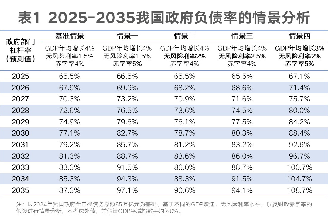 利率、经济增长以及赤字率是影响政府债务的三个主要因素。基于2024年我国政府负债率(65.7%),假设未来10年每年的赤字率为4%,GDP年均增速4%,平均每年GDP平减指数为0%,无风险利率为1.5%(目前我国政策利率,即7天OMO利率为1.5%),通过对我国未来的政府负债率进行模拟,我们得到2035年末的政府负债率为87.3%(见表1中的“基准情景”),比2024年末提高21.6个百分点。其中,由利率贡献9.9个百分点,财政赤字贡献36.4个百分点,经济增长贡献-24.6个百分点。应该看到,如果债务的增加能有效带动经济增长,后者对杠杆率抬升的抑制作用是比较明显的。