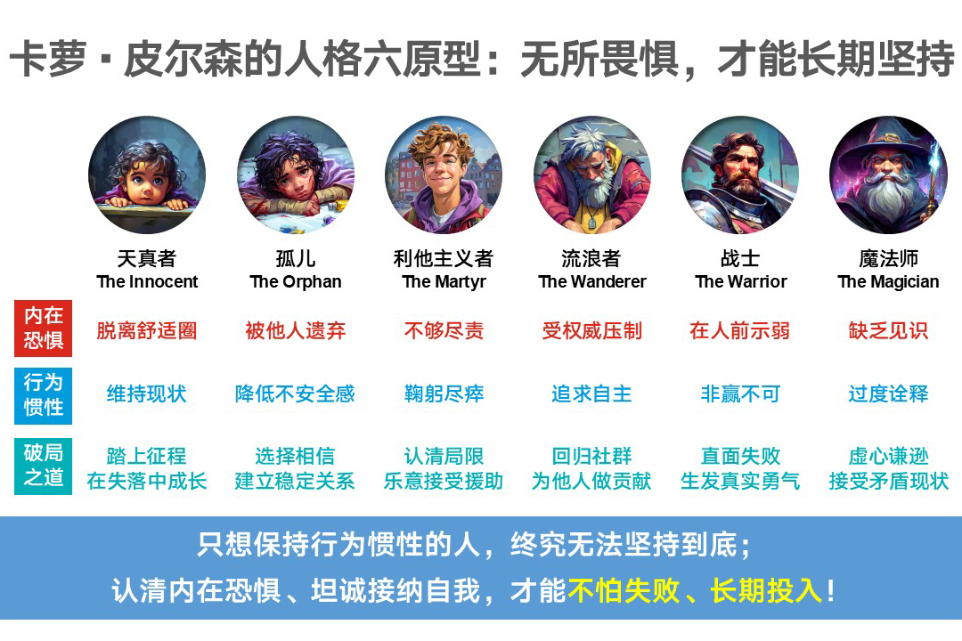 卡罗尔•S•皮尔森教授从荣格的原型心理学(Archetypal Psychology)中发展概括总结出6种原型概念:孤儿,流浪者,战士,利他主义者,天真者,魔法师。