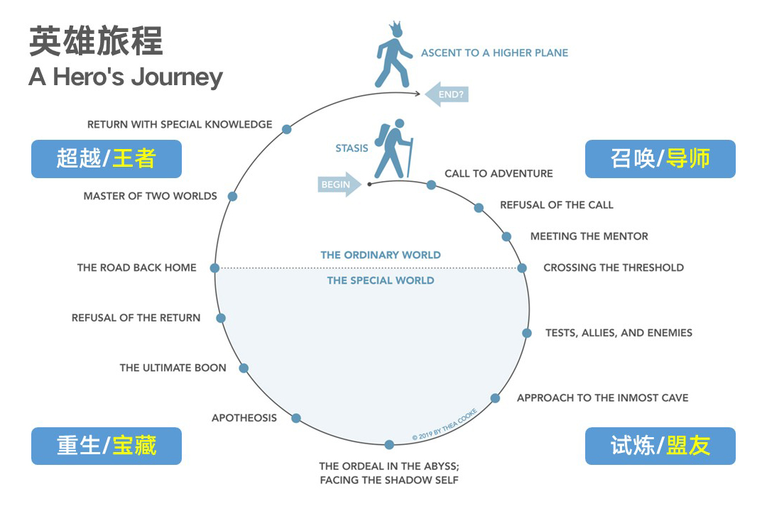 他们的历程可以用以下的“英雄旅程”图来概括。这张图根源于美国神话学家约瑟夫·坎贝尔1949年的经典著作《千面英雄》。在书中,坎贝尔通过对全球各民族神话的比较,首次系统提出了一个共通的英雄叙事结构,并详细列出了17个阶段。1980年代,好莱坞编剧导师克里斯托弗·沃格勒为了方便电影创作,将坎贝尔的理论压缩为12步,并以圆环视觉化呈现,使之成为今日影视、游戏及动漫行业广泛使用的环形结构图。