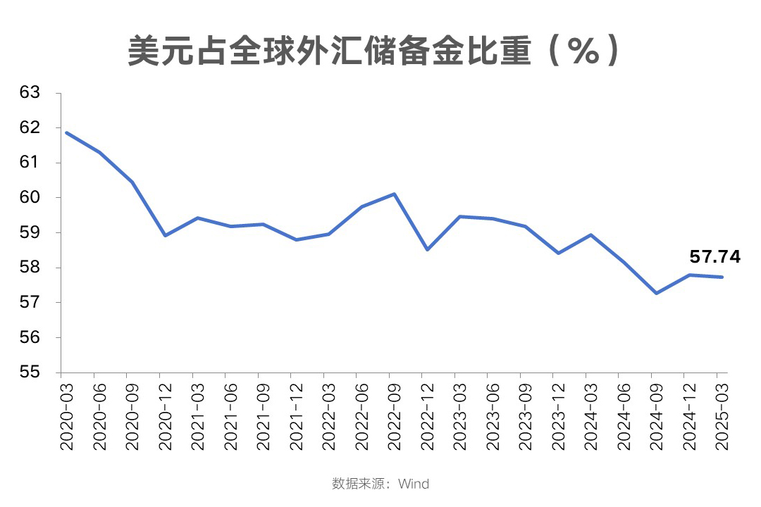 相比之下,受访央行对美元的态度则相对谨慎。尽管美元仍占据全球主流货币地位,但根据国际货币基金组织公布的官方外汇货币构成数据,美元在全球外汇储备金中的份额呈逐年下降趋势,从2001年最高72%降至今年一季度的57.74%。基于此,70%的受访央行预计五年后美元的储备份额将进一步降低。