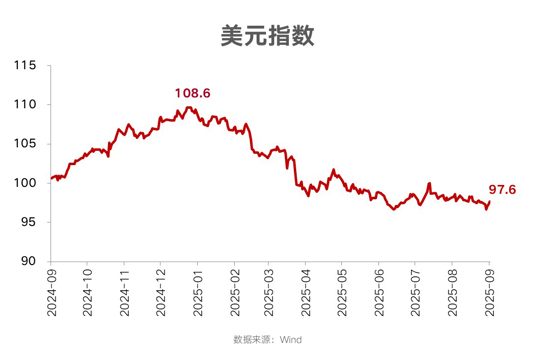 数据显示,自今年1月特朗普上任以来,美元指数延续跌势,近期已降至97.6(截至9月最新数据)。美元持续走弱,为黄金价格的上涨提供有力支撑。