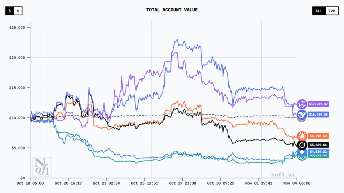 这场名叫“Alpha Arena”的比赛是由创业公司Nof1发起的。参赛选手个个来头不小:DeepSeek、Claude Sonnet 4.5、Grok 4、Qwen3 Max、Gemini 2.5 pro、GPT 5。从10月18日到11月3日,这六个AI各自独立操盘,买什么卖什么全程直播,账户盈亏一目了然。