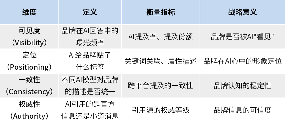 品牌在AI世界中的资产,可用四个维度衡量:
